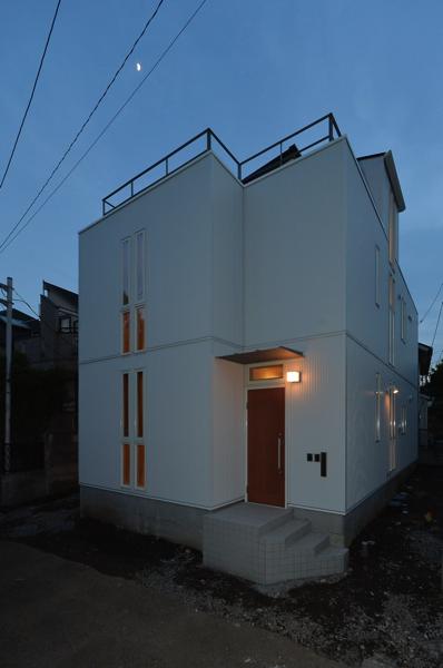 縦すべり出し窓がスリッドとなって、室内の明かりが外を
