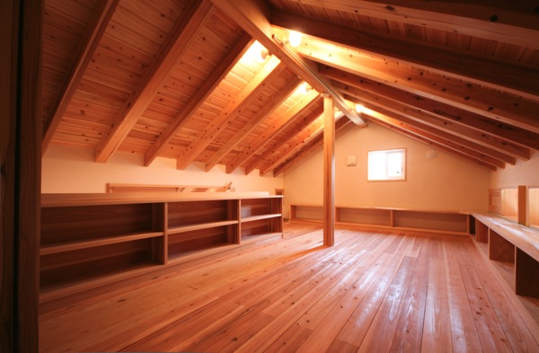 床は無垢の杉材、壁は漆喰塗り、天井は杉の縁甲板で